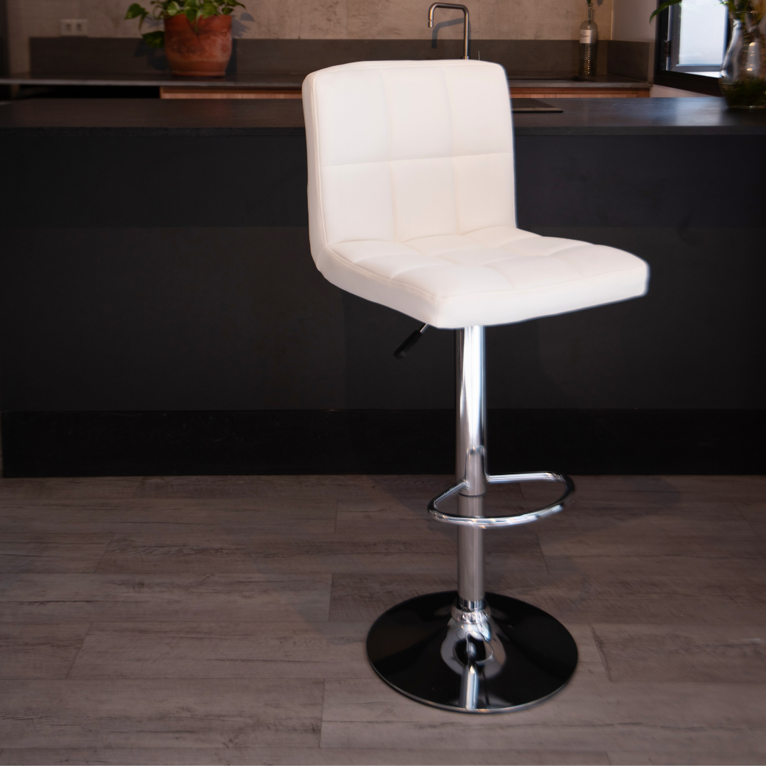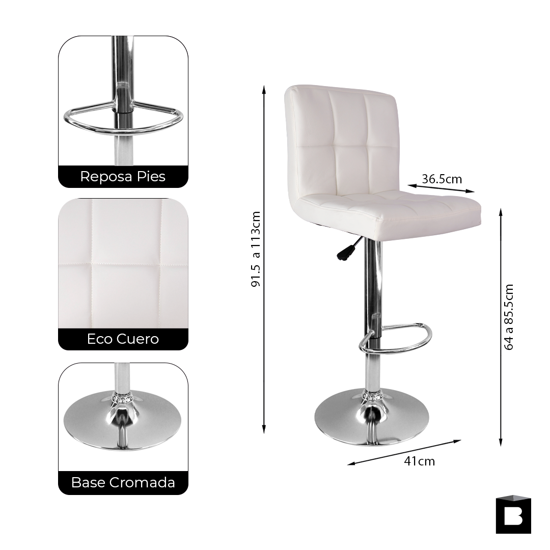 Cuenta con sistema de altura ajustable, que se regula fácilmente mediante una palanca metálica ubicada debajo del asiento, permitiendo adaptar la silla a diferentes alturas de barra o mesa.
