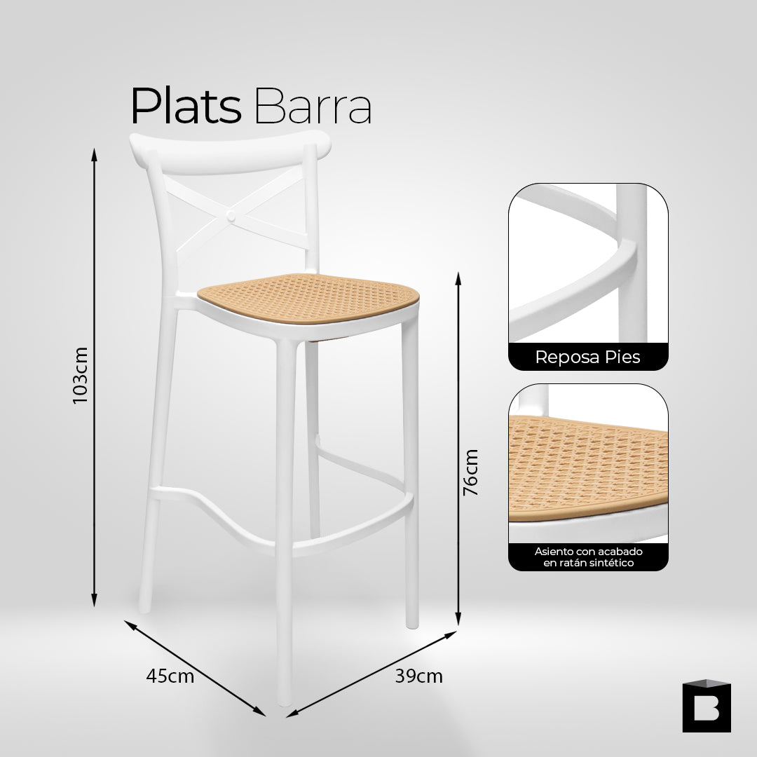 La silla PLATS Barra combina un diseño moderno con acabado tipo ratán, ideal para espacios como barras, cocinas tipo americana, terrazas o zonas sociales. Su estética tipo tejido hexagonal aporta un estilo natural y elegante que se adapta fácilmente a diferentes ambientes.