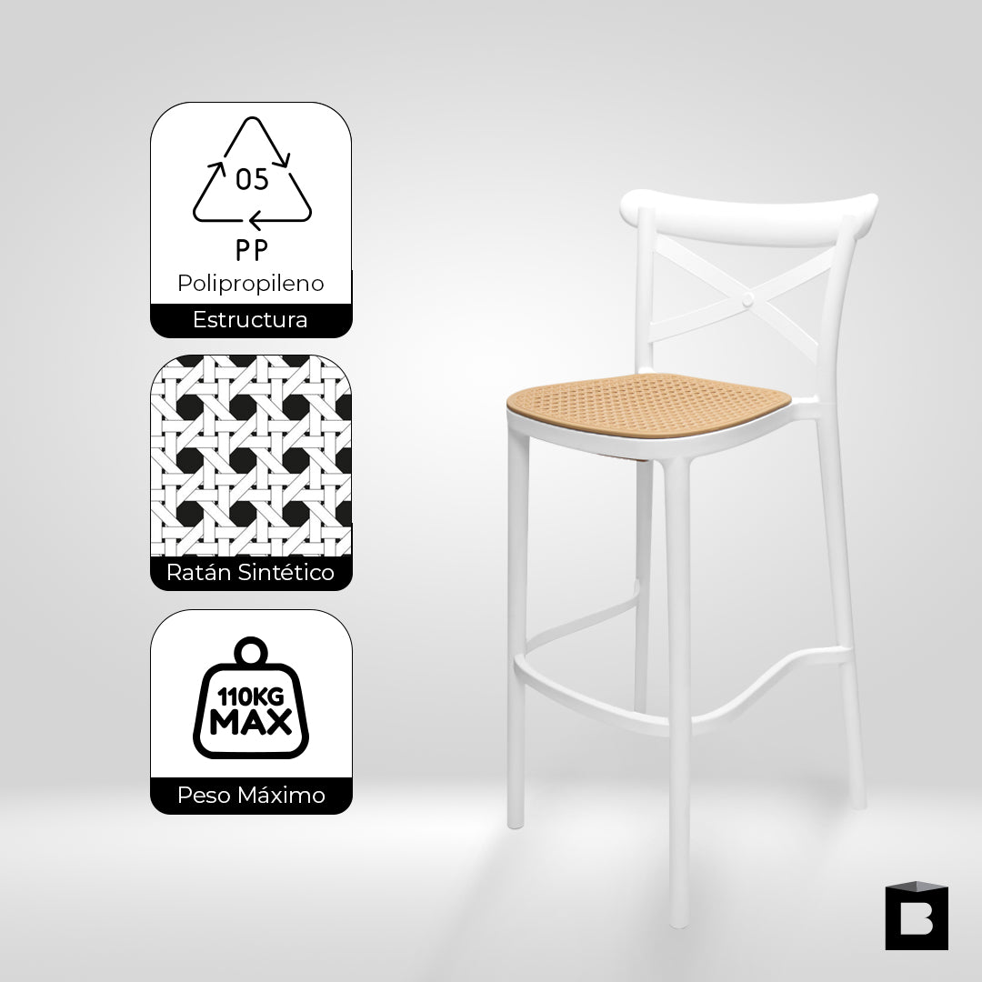 Fabricada en polipropileno inyectado de alta resistencia, cuenta con respaldo y asiento en ratán sintético, ofreciendo durabilidad y fácil mantenimiento. Además, incluye protección UV, lo que la hace apta para uso en interiores y exteriores, resistiendo la exposición al sol y la humedad.