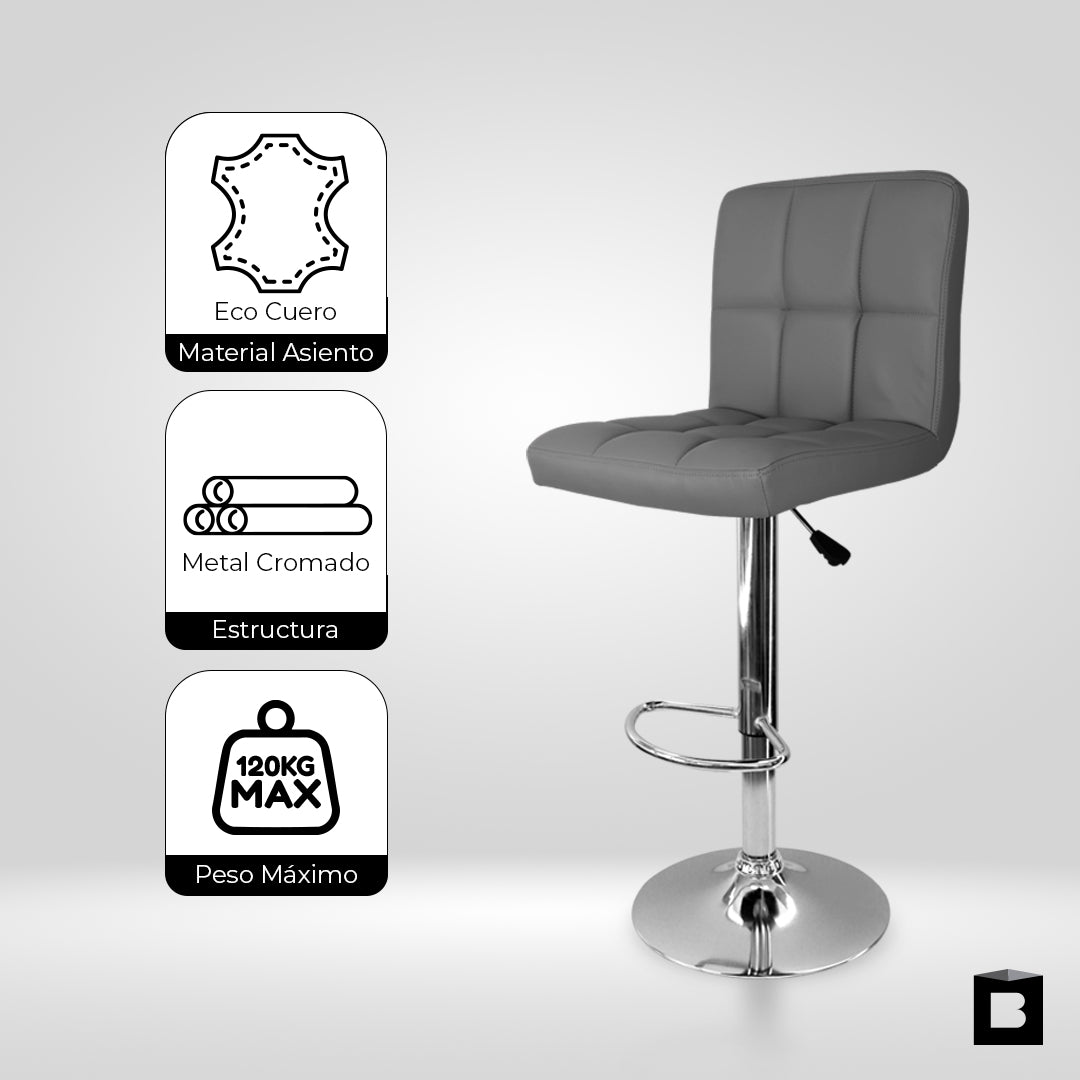 Cuenta con sistema de altura ajustable, que se regula fácilmente mediante una palanca metálica ubicada debajo del asiento, permitiendo adaptar la silla a diferentes alturas de barra o mesa.