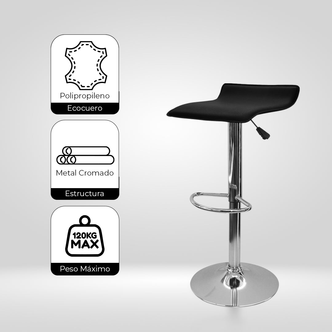 Cuenta con base en acero cromado, que brinda estabilidad y durabilidad, y un asiento tapizado en eco cuero, ofreciendo mayor comodidad. Además, posee regulación de altura y apoyo para los pies, lo que garantiza una experiencia cómoda y funcional para el uso diario.
