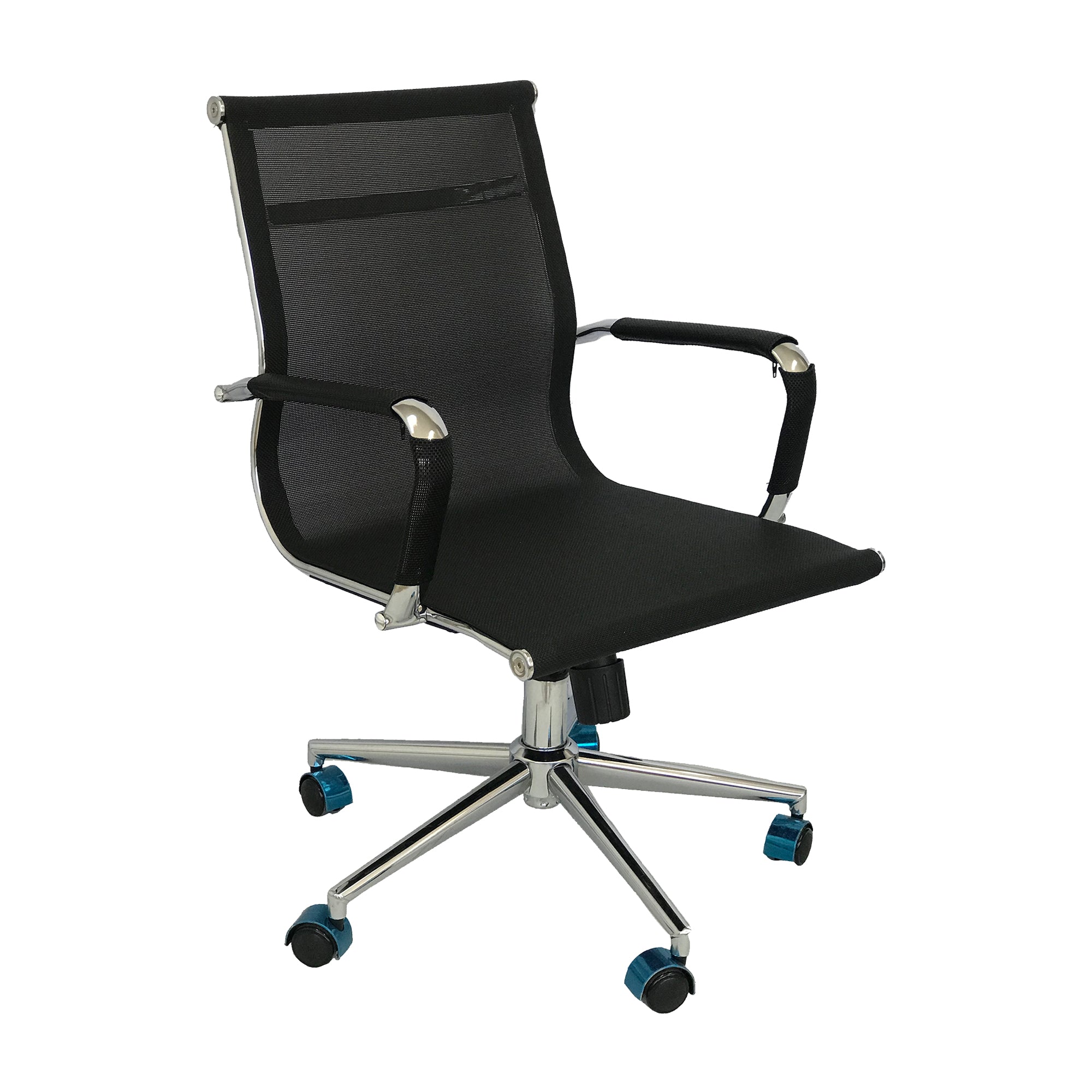 Esta silla tiene una estructura metálica cromada, su diseño es Elegante, tiene regulación de graduación de altura a gas (nitrógeno comprimido), esta tapizada en Tela tipo Malla sintética color Negra, brazos en metal fijos, su base es cromada, tiene 5 aspas, rodachines en goma y control debajo del asiento para accionar la graduación de altura del asiento.