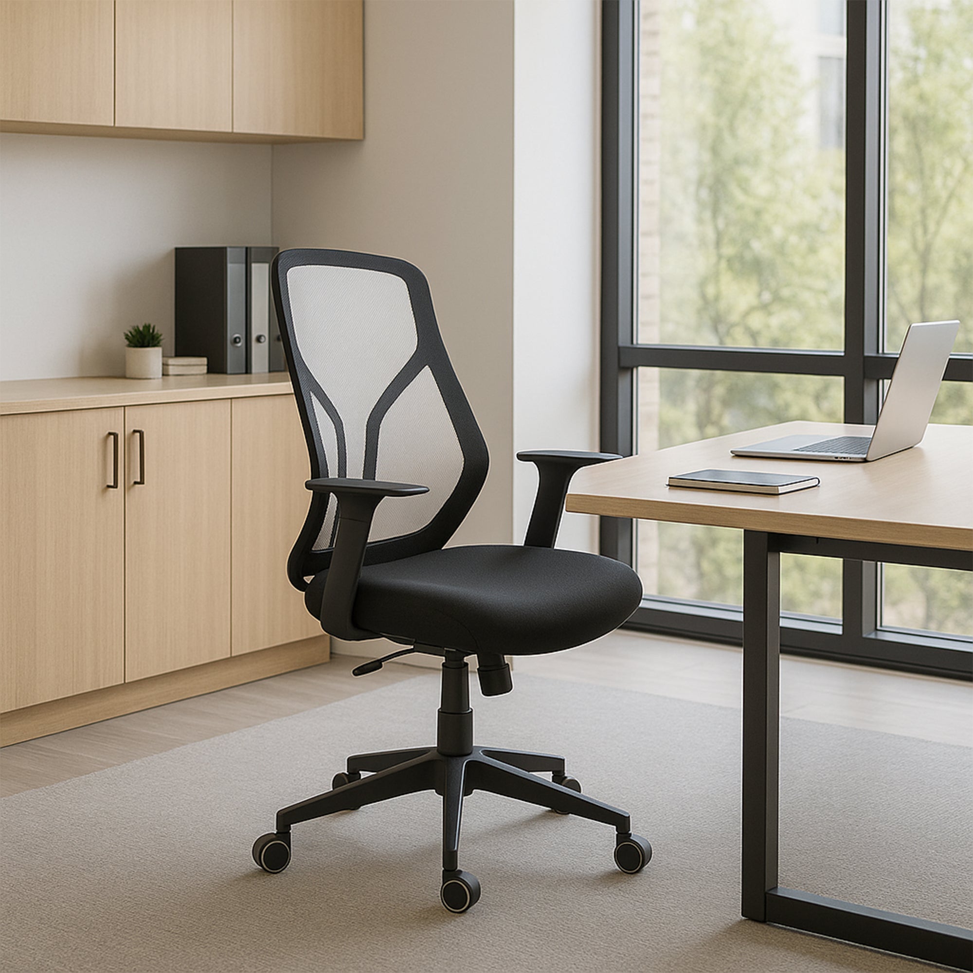 Silla de oficina CAMILA, esta diseñada para ofrecer un soporte óptimo en entornos laborales. Cuenta con apoyabrazos fijos y un respaldo tapizado en malla tipo tela microperforada transpirable, ideal para largas jornadas. Su asiento acolchado con revestimiento de malla, garantiza comodidad. Con un sistema giratorio de 360°, y altura regulable mediante pistón neumático, esta silla te ofrece flexibilidad total. Fabricada en polipropileno de alta resistencia, tanto en la estructura como en las ruedas, es duradera y resistente. Fácil de ensamblar en 30 minutos. ¡Perfecta para cualquier oficina moderna!