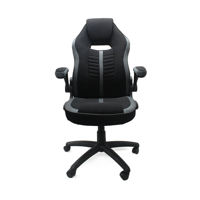 Silla Gamer Topgun, tejido negro y malla color gris, reposabrazos ajustables, tiene mecanismo de elevación, bloqueo e inclinación, regulación de graduación de altura a gas (nitrógeno comprimido), su base de plástico arqueada y tiene ruedas de PU color gris que no rallan el piso.