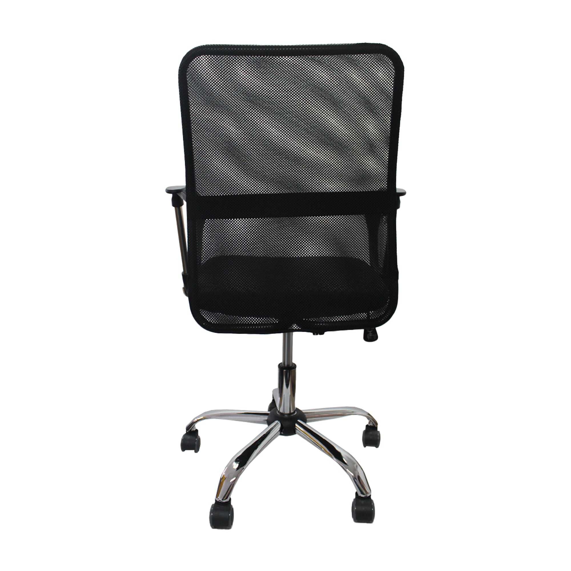 Esta silla tiene una estructura metálica cromada, su diseño es Elegante, tiene mecanismo de bloqueo y regulación de graduación de altura a gas (nitrógeno comprimido), con asiento y respaldo en espuma inyectada, esta tapizada en malla negra , apoyabrazos en polipropileno negro con Metal. , su base es cromada, tiene 5 aspas, rodachines en goma y control debajo del asiento para accionar la graduación de altura del asiento.