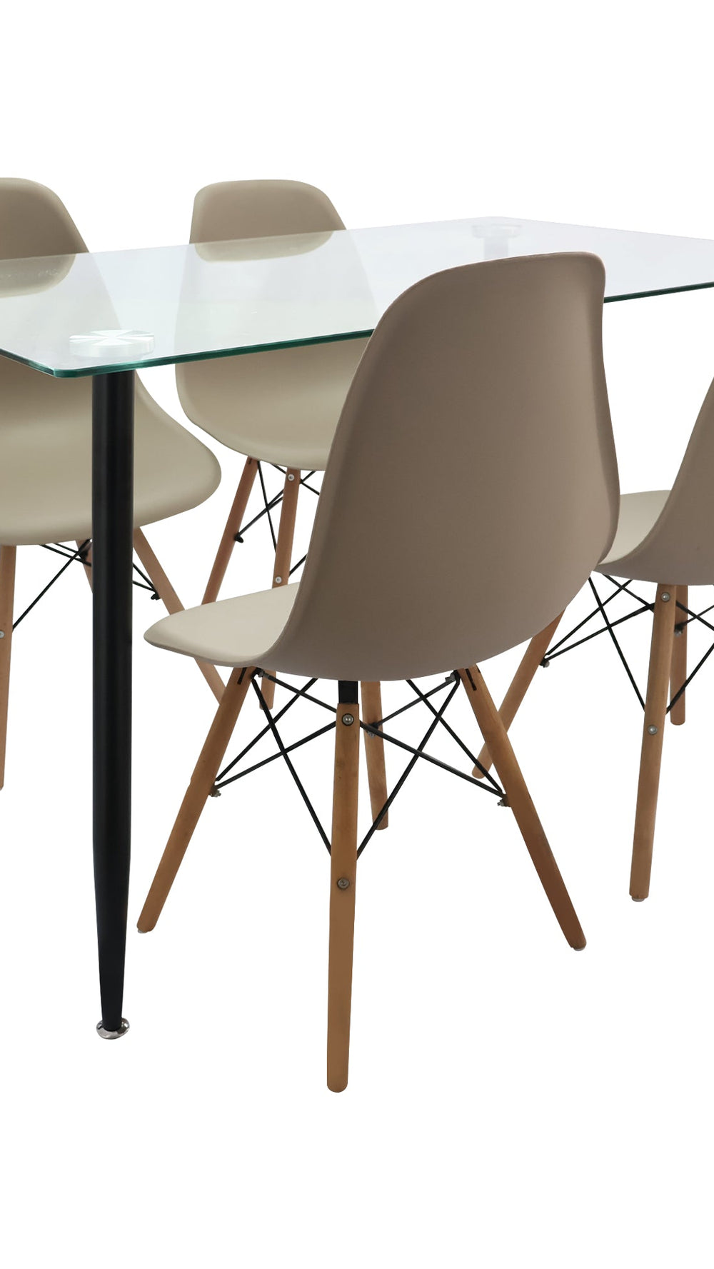 COMEDOR RECTANGULAR TAPA VIDRIO MÁS 4 SILLAS DKR TIPO EAMES BEIGE