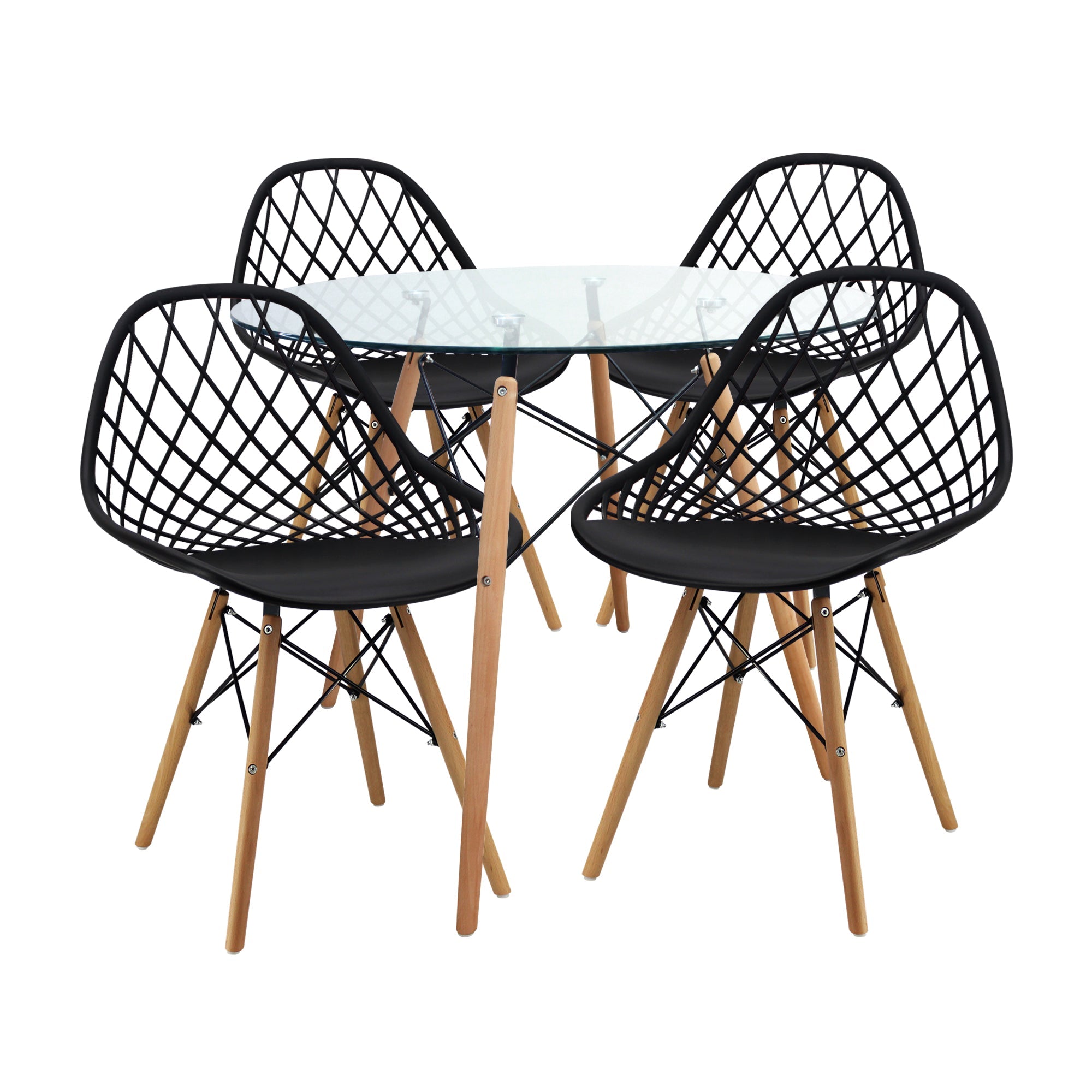Mesa Comedor Redonda BoxBit, diseñada con tapa de cristal y base de madera con alambres de acero al carbono pintados entrelazados.