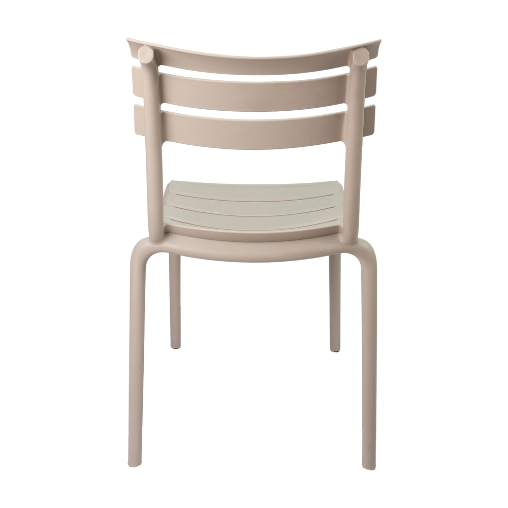 Silla fabricada en polipropileno (plástico) inyectado con gas nitrógeno, lo que garantiza alta resistencia y durabilidad. Apilable hasta 4 unidades, con tapones antideslizantes para mayor estabilidad. Protección UV que la hace apta para interior y exterior. Soporta hasta 136 kg. Ideal para espacios reducidos y fácil de combinar con distintos estilos de decoración.