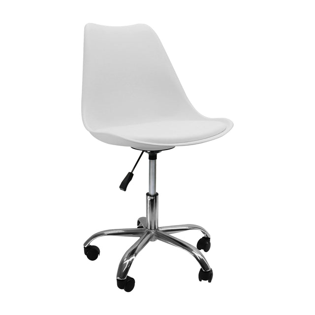 Esta silla va bien en espacios interiores de tu casa, como: habitación u oficina. Fabricada en polipropileno inyectado de gran resistencia con asiento tapizado (eco cuero) y base cromada tipo estrella de 5 puntas.