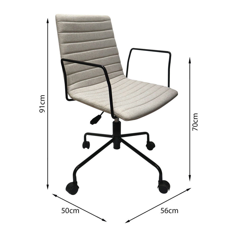 Descubre la silla de oficina LIMA, una opción elegante y funcional para tu sala de espera o sala de reuniones. Esta silla cuenta con un respaldo acolchado y apoyabrazos fijos en metal, asegurando comodidad durante largas horas de uso. Su altura regulable, gracias al pistón neumático, y su base giratoria de 360° te permiten moverte con facilidad en cualquier espacio. Tapizada en tela de lino beige, aporta un toque sofisticado a tu ambiente, mientras que su estructura metálica y estrella de metal negro garantizan durabilidad. Con un sencillo ensamblaje en solo 30 minutos y una capacidad máxima de 110 kg, la silla LIMA es perfecta para quienes buscan un equilibrio entre estilo y confort. ¡Renueva tu espacio con esta silla versátil y moderna!