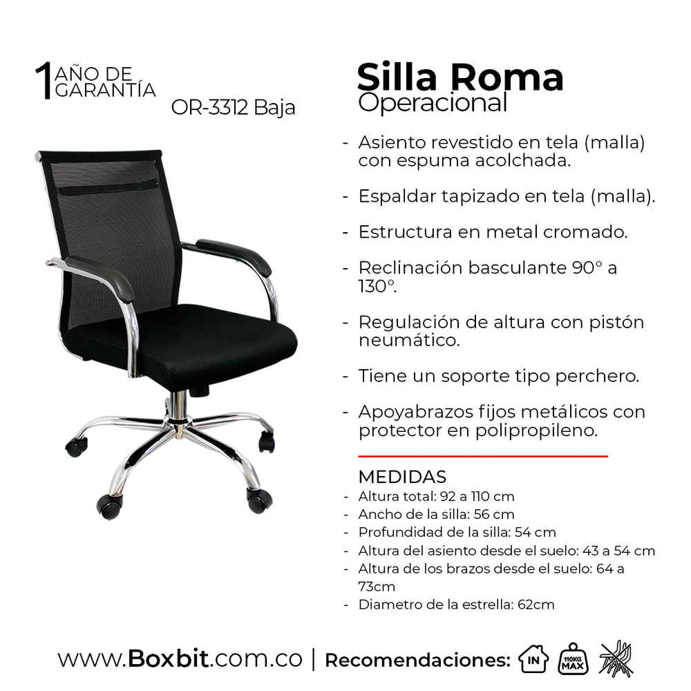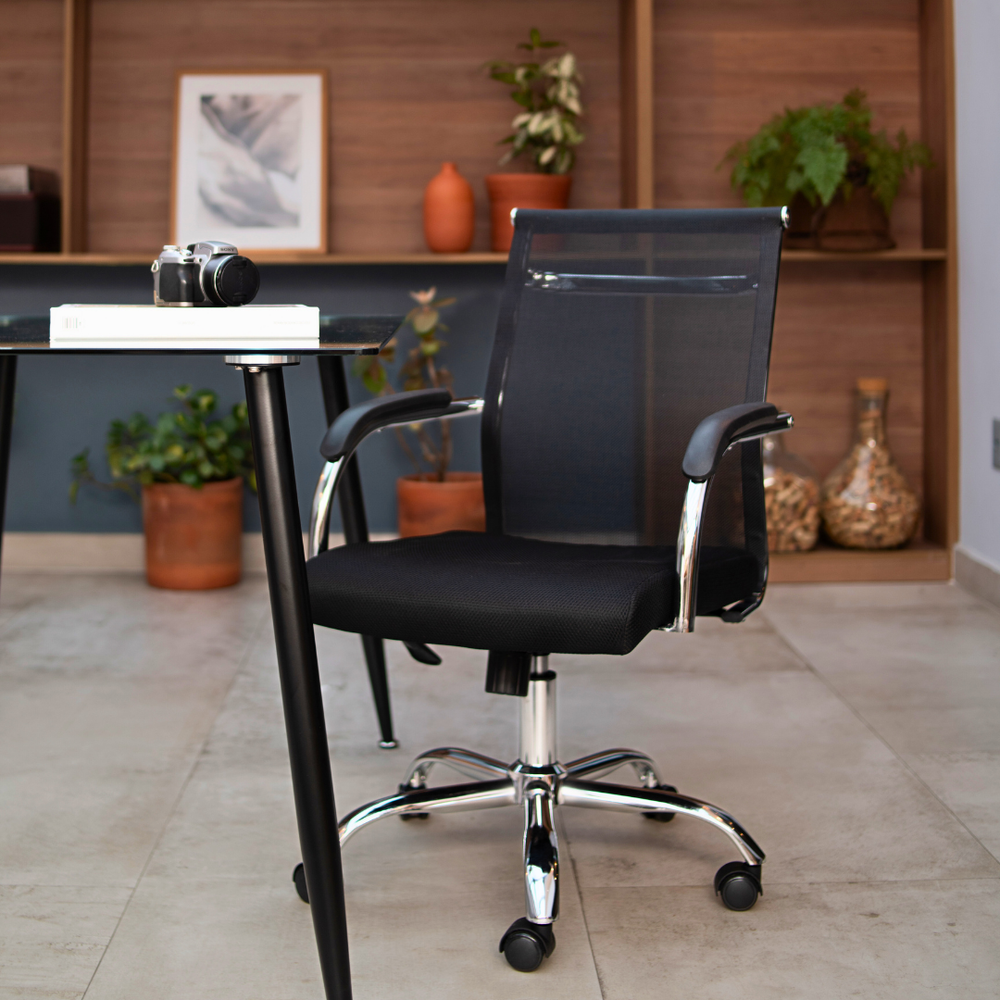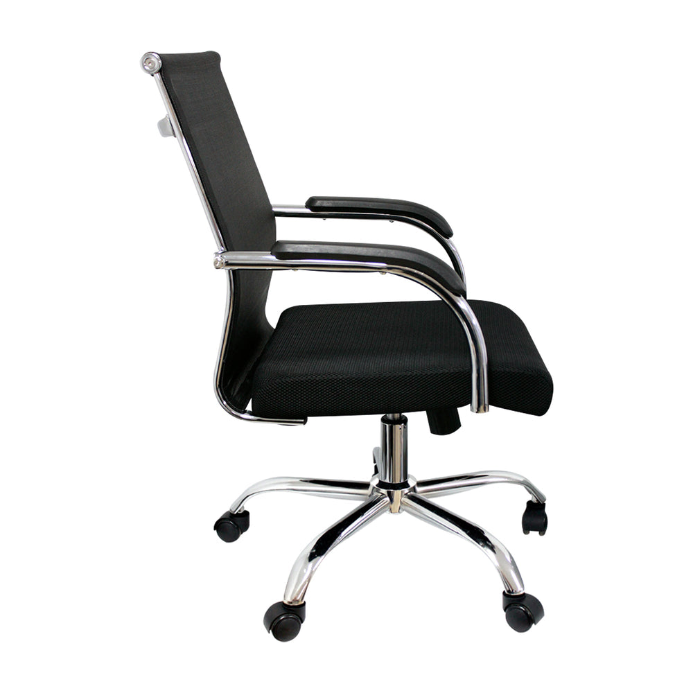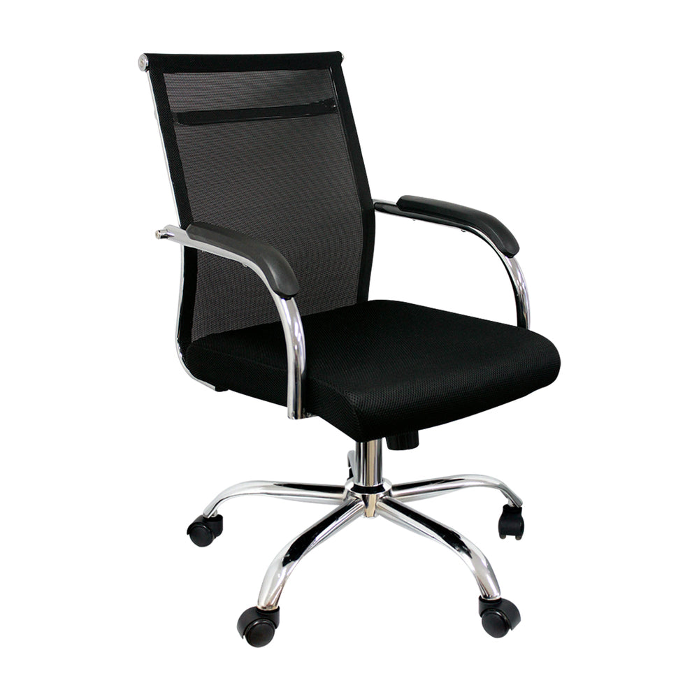 Su estructura es metálica cromada, su espaldar es tapizado en malla, su asiento es acolchado con esponja de alta elasticidad, forrado en cuero sintético, tiene brazos fijos, la tapicería es en color Negro, tiene regulación de graduación de altura a gas (nitrógeno comprimido). Tiene cinco puntas con estructura tipo estrella en pintura electrostática, sus ruedas son negras en goma.